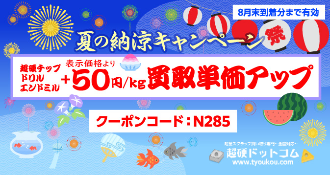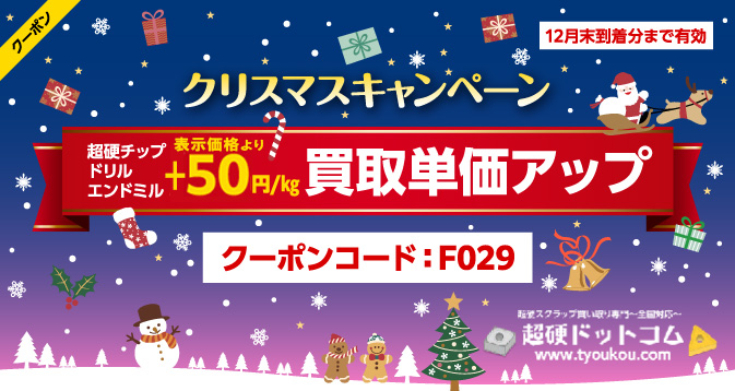 愛知県K社様より、超硬ドリル・エンドミル・チップを宅配買取でお送り頂きました。いつもご利用いただきありがとうございます。クリスマスキャンペーンの50円アップの対象だった事、大変喜んでいただけました。またのご利用お待ちしております。